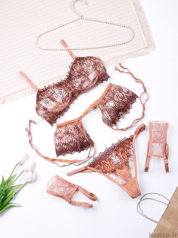ست بند جوراب و شورت و سوتین چهار تیکه فنردار توری Bereta برتا کد 4041BR از جنس توری (کشسانی کم) است که روی آن گلدوزی کار شده است. سوتین این ست فنردار و نیم کاپ میباشد و پوشانندگی بالای سینه را ندارد . مدل شورت بکلس از جنس توری و نخ است . لایه داخلی فاق شورت نخی است. این ست علاوه بر زیبایی، راحت هم هست و ظرافتش حتی از عکس هم به چشم میاد و تنخورش عالیه.