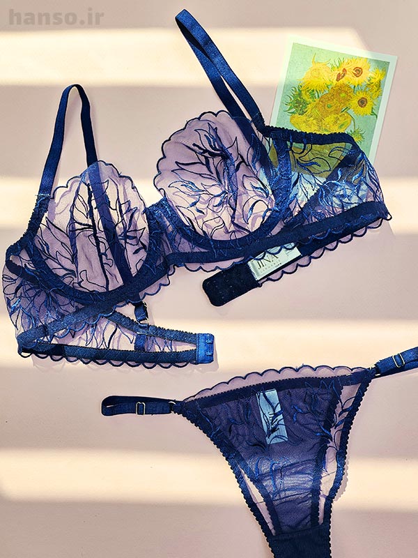 ست شورت و سوتین فنردار توری ژینا Jina سرمه ای کد 2006 ، از جنس توری (کشسانی کم) است که روی آن گلدوزی کار شده است. سوتین این ست فنردار و نیم کاپ بوده و سینه را کامل نمیپوشاند، مدل شورت بکلس از جنس توری و لایه داخلی فاق شورت نخی است. این ست علاوه بر زیبایی، راحت هم هست و ظرافتش حتی از عکس هم به چشم میاد و تنخورش عالیه.